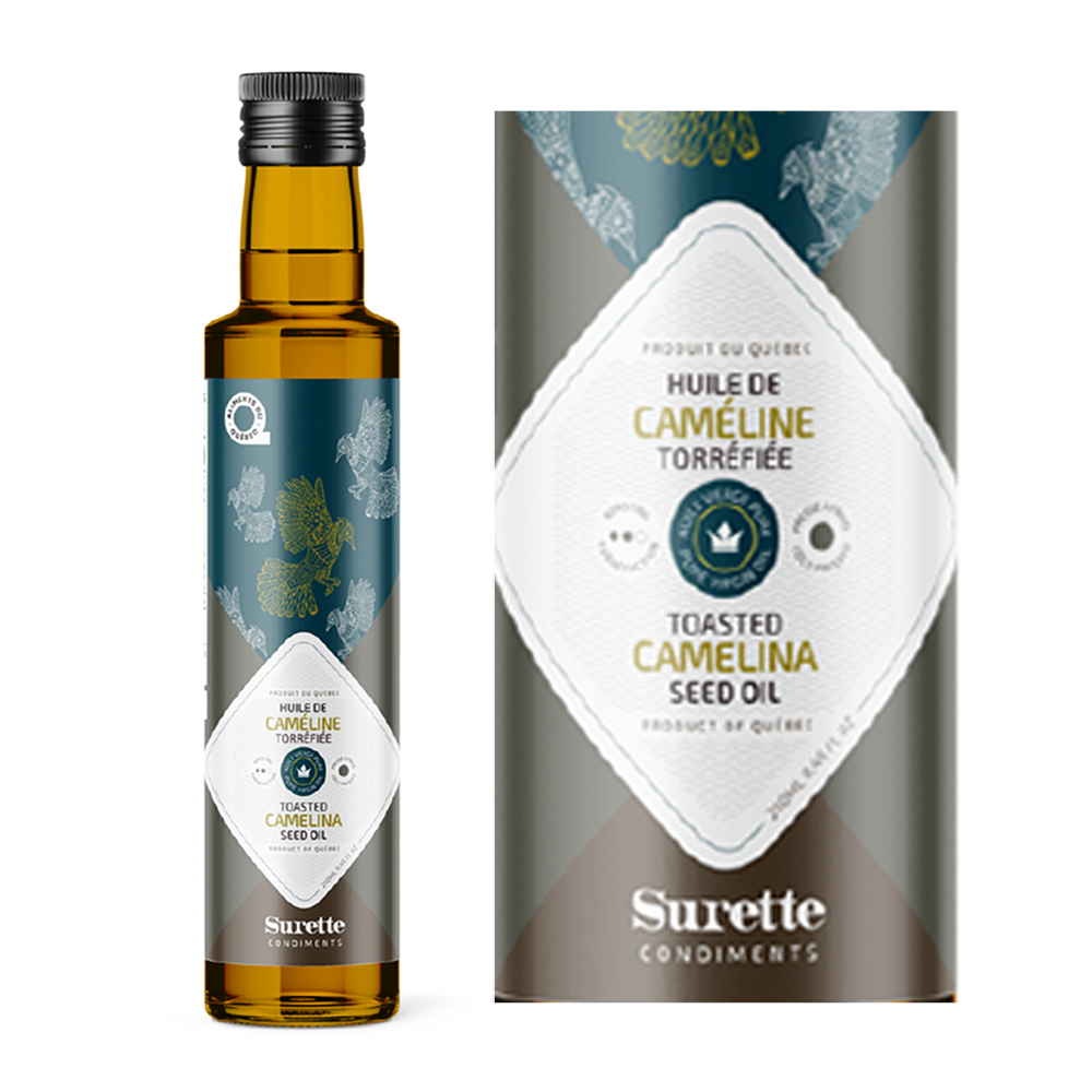 Surette (CANADA) - Toasted camelina virgin oil with an amber hue. Cold-pressed camelina seeds from the village of Saint-Édouard in Montérégie. Its unique taste reveals round notes of peanut, cruciferous vegetables, and toasted sesame. Can be used as a finishing touch or lightly heated. Available in 250ml bottles